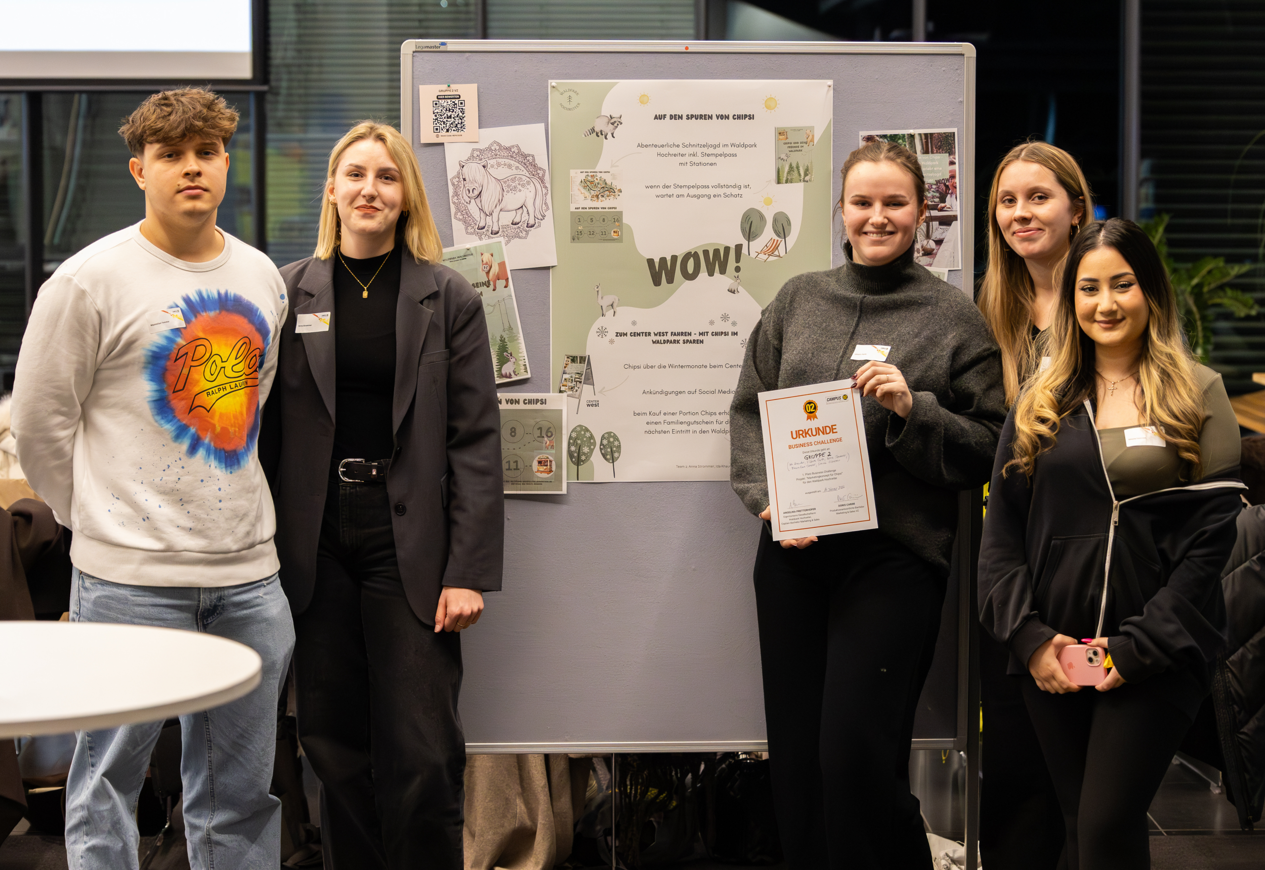 Ein weiterer Programmpunkt des Abends waren die Making-Of-Videos der Studierendenteams, die spannende Einblicke in den zweitägigen Arbeitsprozess der Business Challenge boten. Innerhalb von zwei Tagen hatten die Studierenden eine vom Captain definierte Aufgabe zu lösen: Die Vollzeit-Studierenden entwickelten eine Marketingstrategie zur Steigerung der Bekanntheit von Chipsi, dem ersten vollautomatischen Chipsroboter. Die berufsbegleitenden Studierenden erarbeiteten parallel dazu konkrete Vorschläge für eine Vertriebsstrategie.